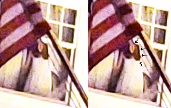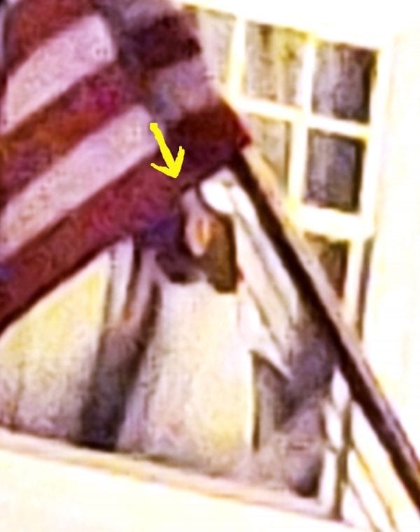 Флаг, который частично блокирует обзор всего окна (флаг №3), вызывает ещё две проблемы. Первая проблема касается двух верёвок (используемых для подъёма и опускания флага), проходящих вдоль флагштока. Левая линия просто исчезает у головы фигуры. Линия обрезана по внешнему краю волос фигуры. Даже когда изображение осветлено, на линию нет и намёка. Из-за того, что оконная рама и верёвка были перекрыты, я начал подозревать, что «голова» фигуры была частью флага. Именно тогда я заметил вторую проблему.