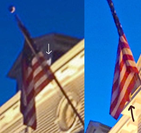 Я ещё раз взглянул на первую фотографию (Фото 1 без привидения) для сравнения и заметил, что у того же флага (№3) за флагштоком выглядывала дополнительная часть, белая и имеющая форму треугольника. Эта дополнительная часть отсутствует на второй фотографии, вместо неё есть часть «головы», отсутствующая на первой фотографии. Кроме того, мы можем видеть ещё одну небольшую часть флага, выглядывающую из другого флага, который тоже обёрнут вокруг флагштока (см. Фото 7).